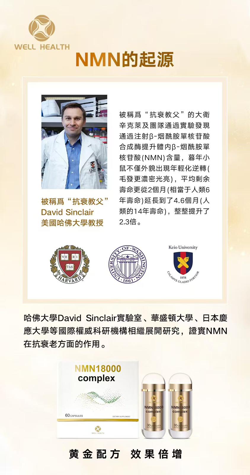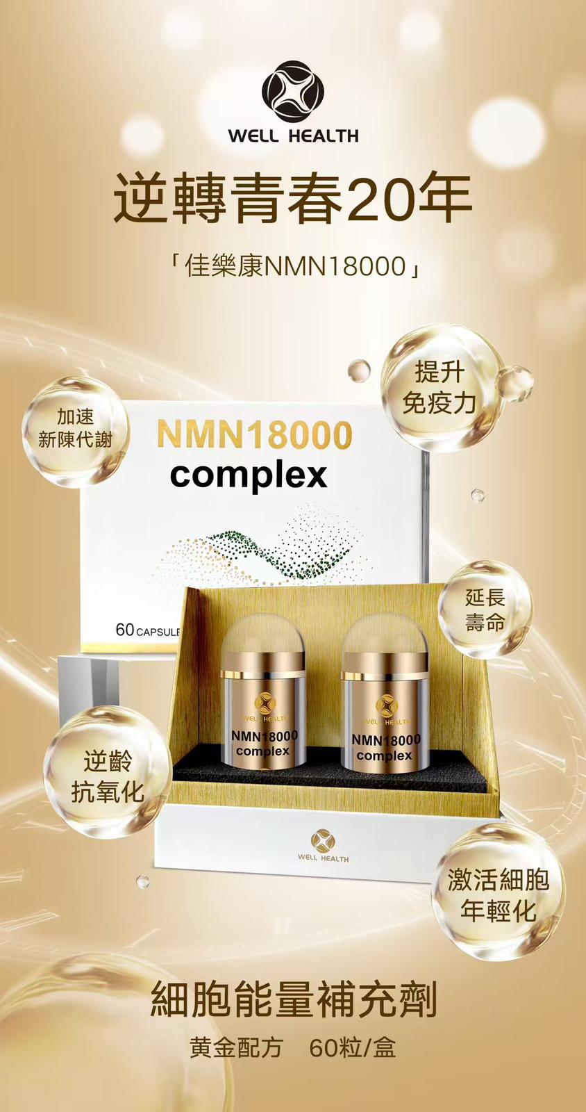 Well Health NMN 18000 Complex 產品規格: 60粒/盒 (買1送1) 商品介紹: Well Health佳樂康 NMN 18000 Complex 黃金配方
